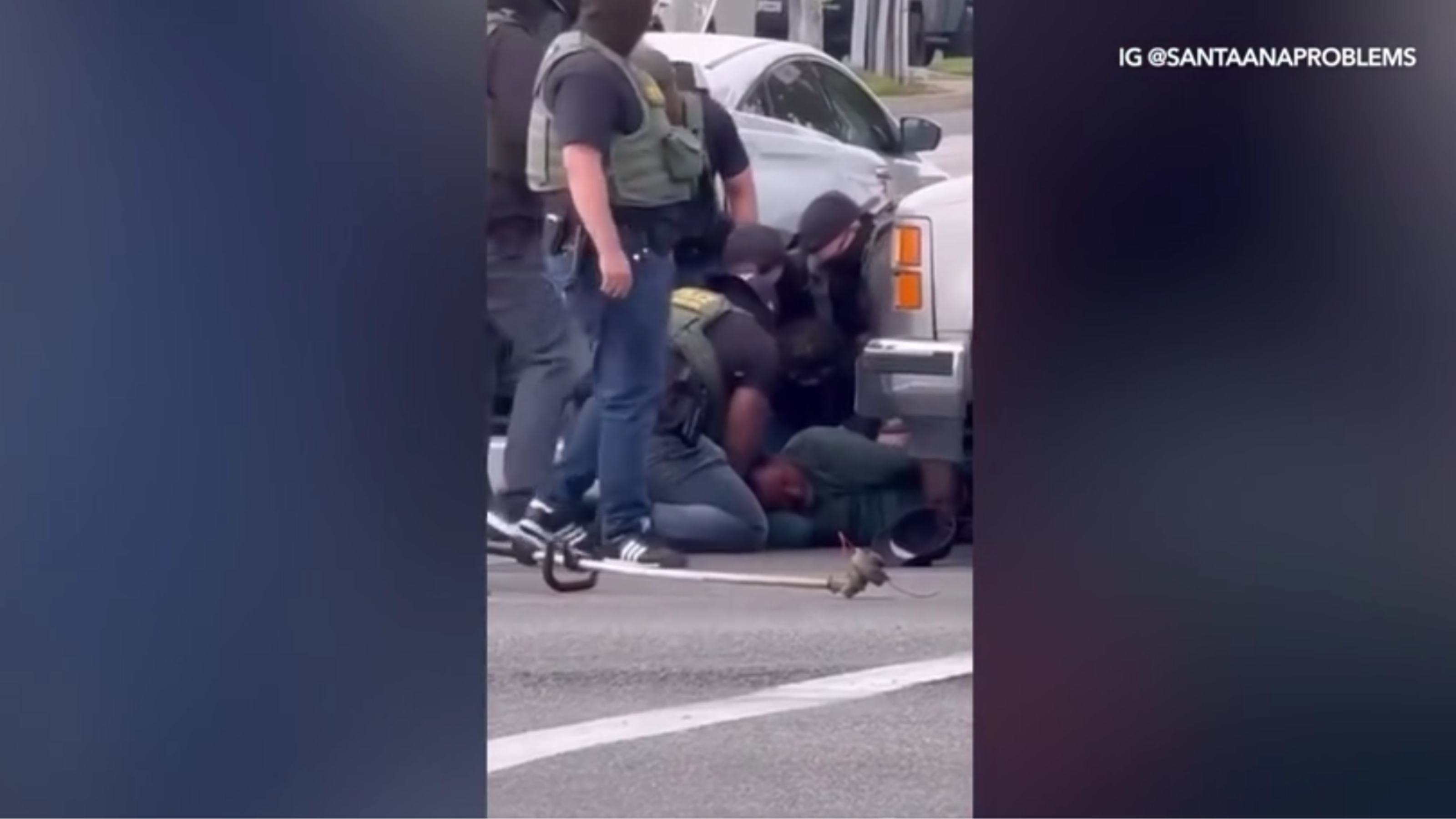 The footage was first posted by the Instagram account @SantaAnaProblems. In the video, agents wearing tactical vests and face coverings are seen surrounding the man, pinning him to the pavement. One agent repeatedly strikes him on the arm and near the head before others lift him up and push him into the vehicle using what appears to be a metal rod. The man did not appear to be seriously injured in the footage.