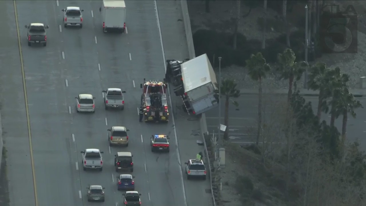 Aerial footage from Sky5 showed a big rig toppled on the eastbound 210 Freeway in Rancho Cucamonga.