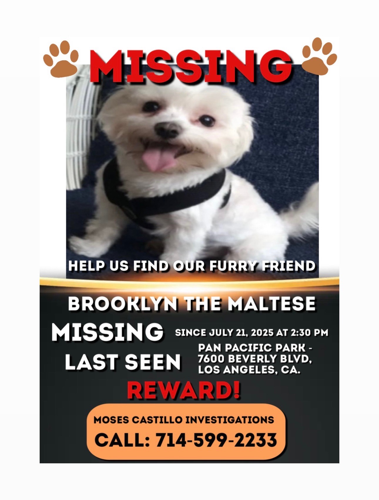 Brooklyn, a 10-year-old white Maltese and registered emotional support animal, went missing Monday, July 21, around 2:30 p.m. while Bayerman was at the park with her young daughter. According to a police report filed by Bayerman and information released by private investigator Moses Castillo, the dog was taken just minutes after she briefly turned her attention away to speak with a passerby.