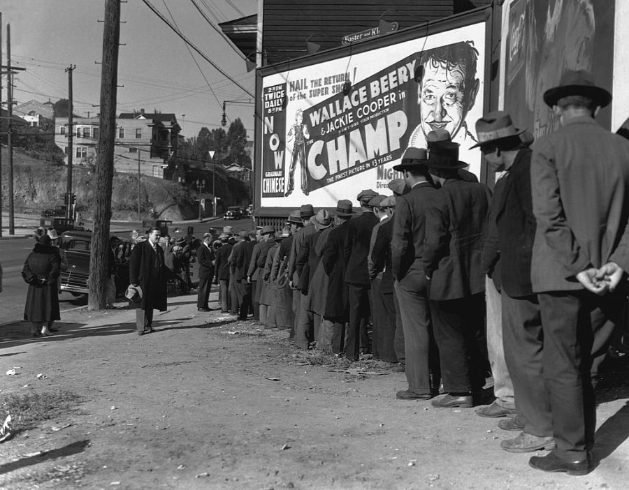 (Original Caption) 09/29/32-Los Angeles, California- All unemployed resdents who are heads of families, living within four corners boundaries ma, by registering, secure both work and food from the Unemployed Cooperative Relief Association. They will get it by trading labor for food, thus eliminating money. Men lined up waiting to be registered at the jobless exchange.
