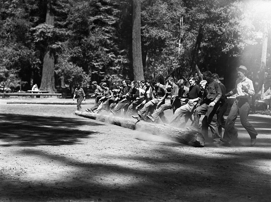 A group of teenage boys roll a log across a clearing at the CCC camp in California State Redwood Park. During the Great Depression, Civilian Conservation Corps provided summer work at its camps for unemployed youths. | Location: California State Redwood Park, California, USA.