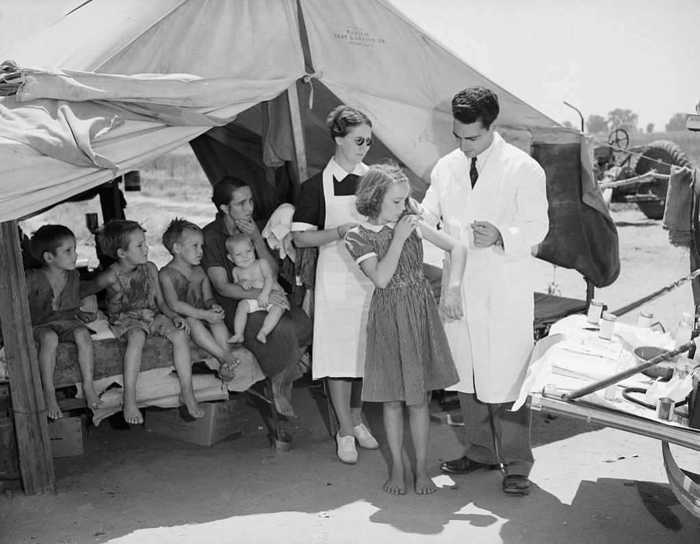 (Original Caption) 10/1/1939- Visalia, CA: Dr, F.H. Redwell and Mrs. Clarise Tucker, nurse both of the state department of public health, immunizing a squatter family for small-pox and typhoid fever. Back of station wagon serves as shelf for medical equipment.