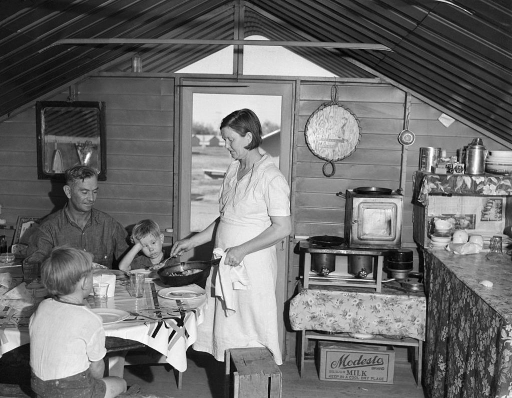 (Original Caption) 10/1/1939-Visalia, California-Dinner in the clean surroundings of a Farm Security Administration camp. The people are called “Grapes of Wrath” families from the book of the same title by John Steinbeck.