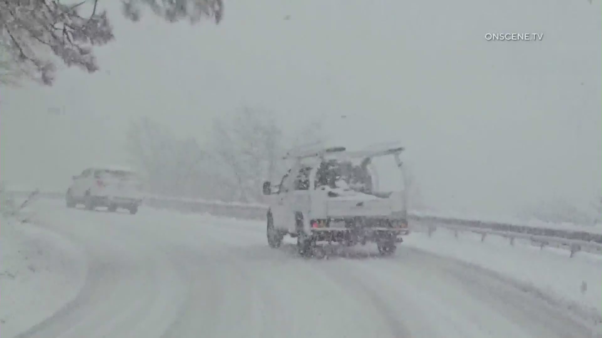 A few feet of snow is expected to fall in the San Bernardino Mountains during this storm, bringing with it whiteout conditions that are impacting local roadways.