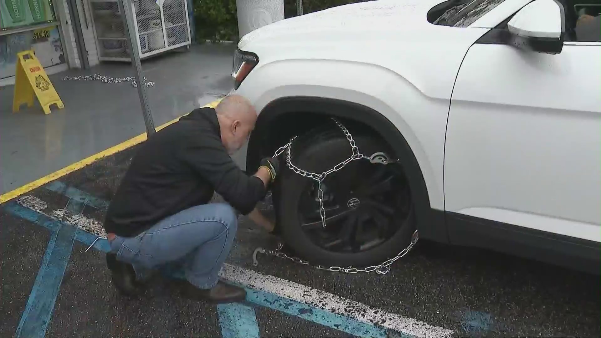 Officials are requiring all vehicles heading up the mountain to be equipped with tire chains. One local business owner who sells chains at his liquor store was seen helping motorists put them on their wheels.