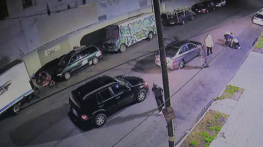 Grainy surveillance shows some of the assailants chasing down the victim and violently knocking him over near the middle of the street, right in front of the two vehicles the suspects pulled up in.