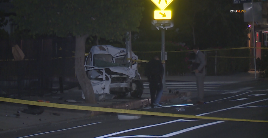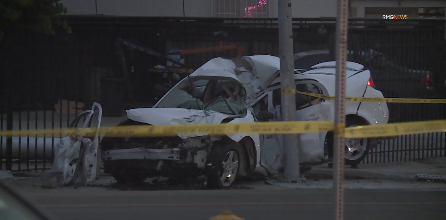Sometime during the pursuit, the victim rammed his SUV into the suspects’ sedan, causing it to lose control and smash into a light pole at the corner of Adams Boulevard and West View Street, according to video from the scene obtained by KTLA.