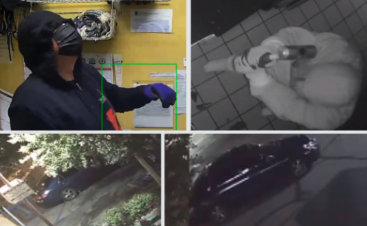 Photos provided by authorities show the suspects shattering the front glass doors of the businesses.