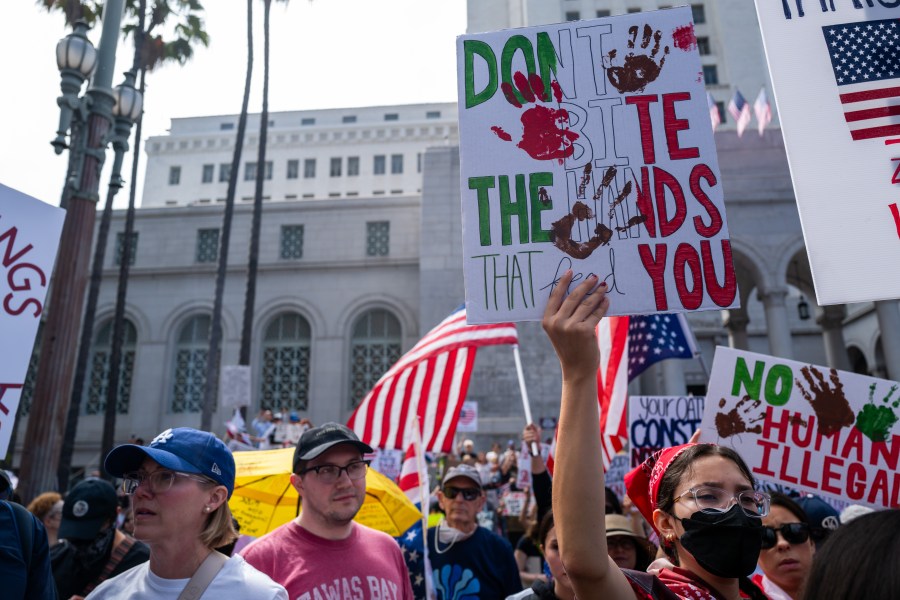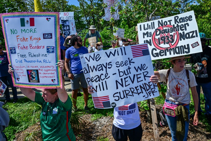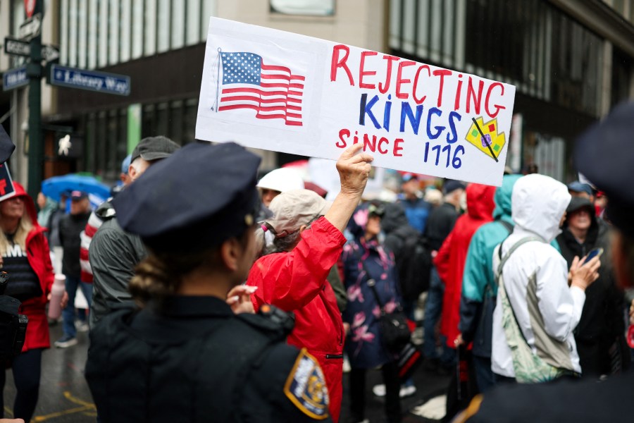 “We’re here to protect our democracy from this administration, from Donald Trump — a wannabe king,” said Hunter Dunn, an organizer with 50501 SoCal, adding that the group’s focus remains on “peaceful civic action.”