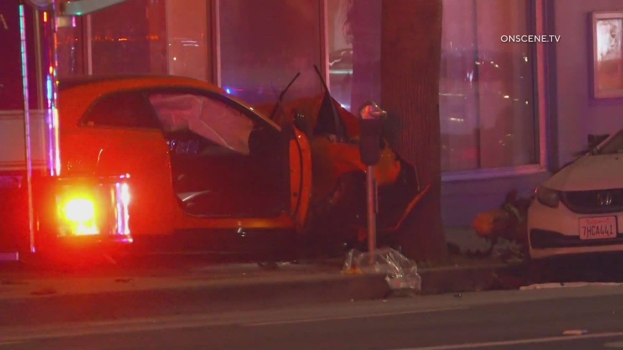 Police said the Dodge was traveling the wrong way on the eastbound lanes of Wilshire Boulevard when it drove onto the sidewalk and struck the four pedestrians. The driver, who remains at large, ditched the vehicle at the scene and fled on foot.