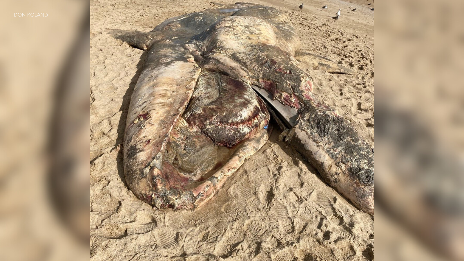 Video sent to KTLA by Don Koland shows the decaying gray whale with seagulls perched atop it on the sand at Bolsa Chica State Beach.
