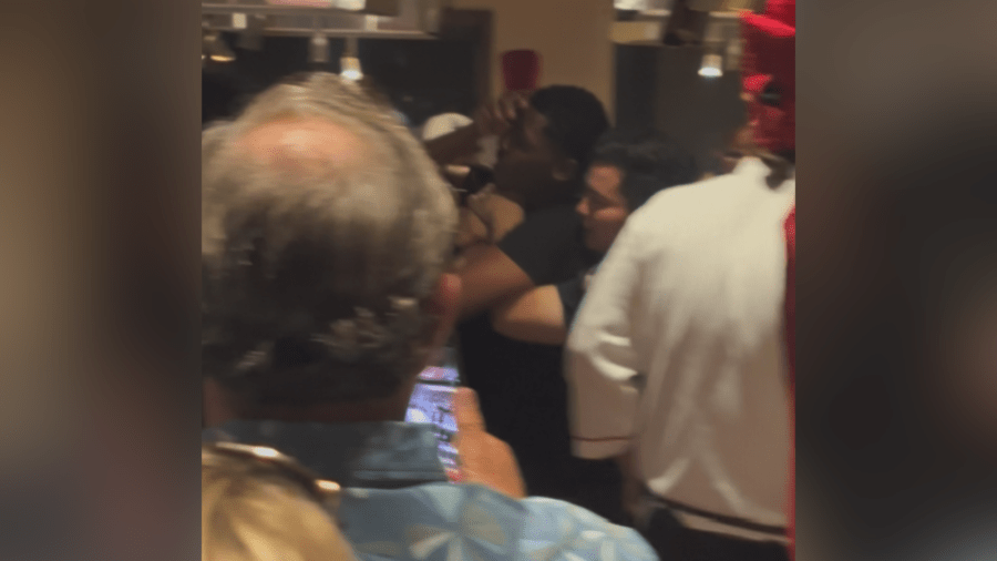 A chaotic scene unfolded at a Benihana restaurant in Torrance on Monday night as an employee and a security guard got into a fight in an incident that was caught entirely on video.