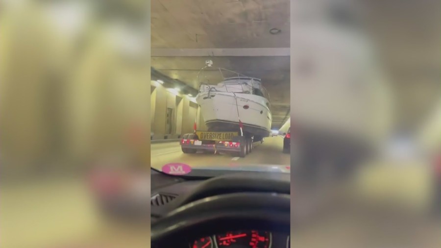 Video posted on social media shows the stuck boat and trailer in the center lane of the northbound span of the tunnel around 1:45 p.m. Friday; motorists were forced to pick a side to go around the stuck boat.