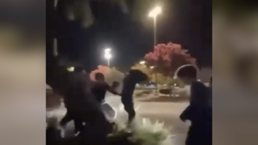 Sgt. Ryan Morton, a spokesperson for the department, confirmed to KTLA via email that four individuals had been arrested on suspicion of battery. He added that one of the suspects is related to a member of the Simi Valley Police Department. That employee was not at the scene and will not be involved in the investigation, officials said, adding that the relationship “has no bearing on this investigation.”