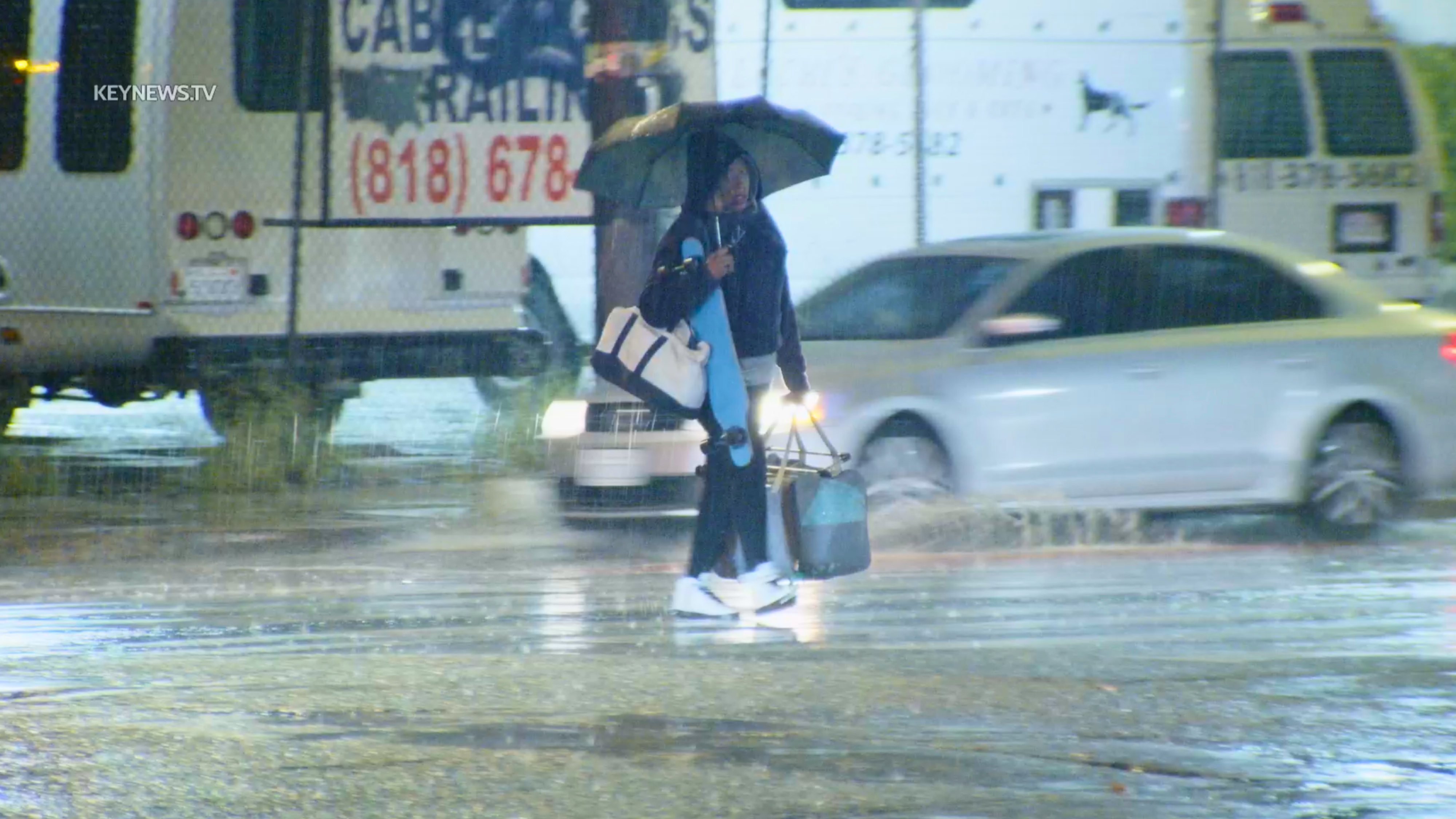 Rain falls on a pedestrian in Van Nuys on Dec. 22, 2023. (KeyNews.TV)