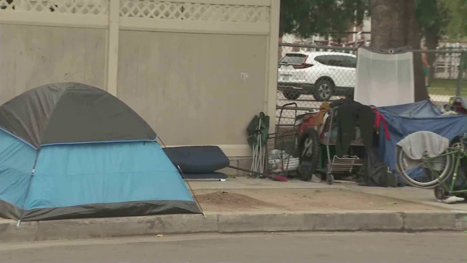 A leaked email has postponed the cleanup of a homeless encampment in West Hills, as shown on June 28, 2023. (KTLA)