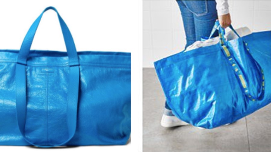 When you look at them side by side, there’s only one major difference: price. Ikea’s “Frakta” bag — made of recyclable plastic — costs 99 cents. Balenciaga’s “glazed leather” and gold-stamped creation is $2,145.