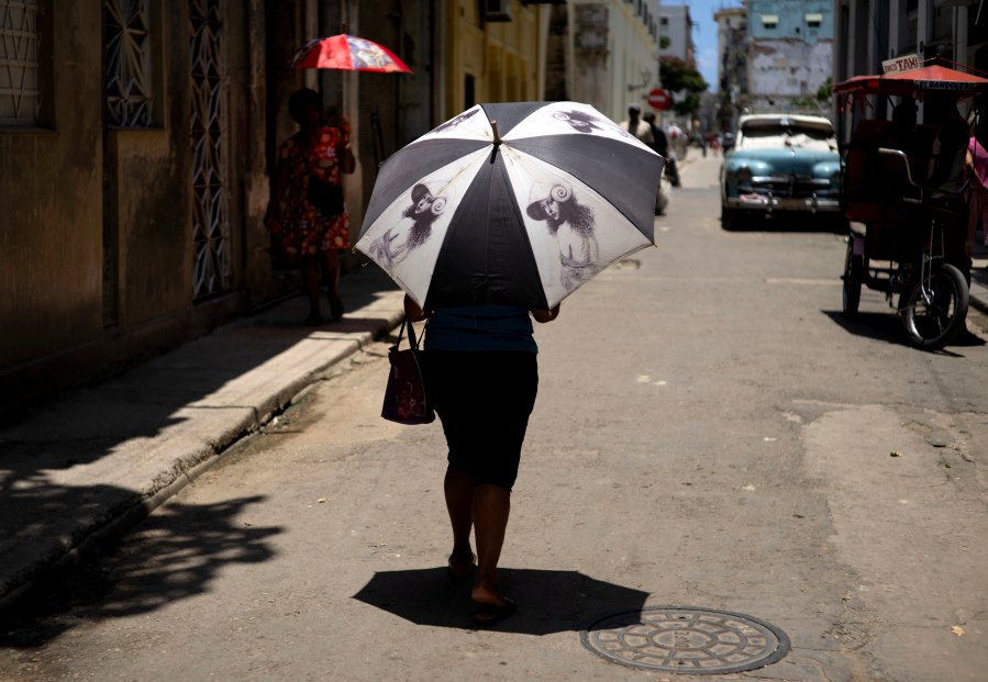 A pedestrian shades herself with an umbrella in Havana, Cuba, Wednesday, July 5, 2023. The entire planet sweltered for the two unofficial hottest days in human record keeping Monday and Tuesday, according to University of Maine scientists at the Climate Reanalyzer project. (AP Photo/Ramon Espinosa)