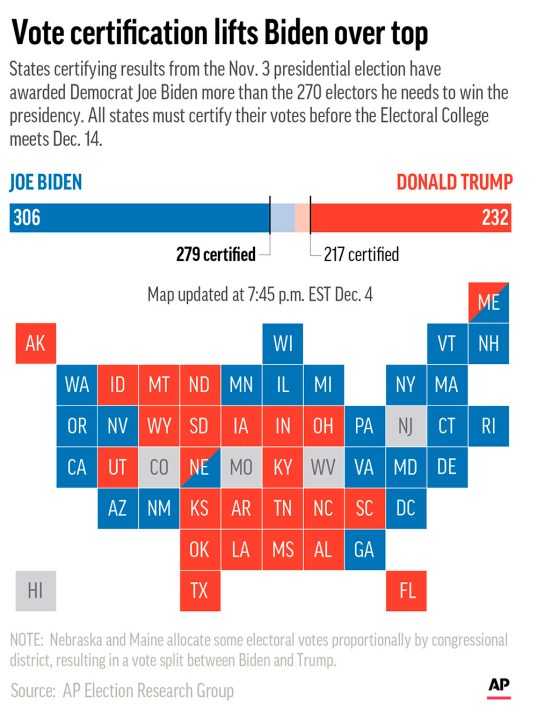 He made no effort in deeply Democratic California, the most populous state in the nation and the trove of its largest number of electoral votes. Three more states won by Biden — Colorado, Hawaii and New Jersey — have not yet certified their results. When they do, Biden will have 306 Electoral College votes to Trump’s 232.
