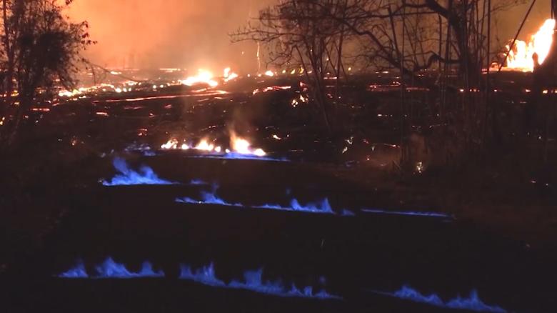 A photo shared by the United States Geological Survey shows striking blue flames peeking through the cracks of the street. Lava from the Kilauea volcano has been burning through plants and shrubs, producing methane.