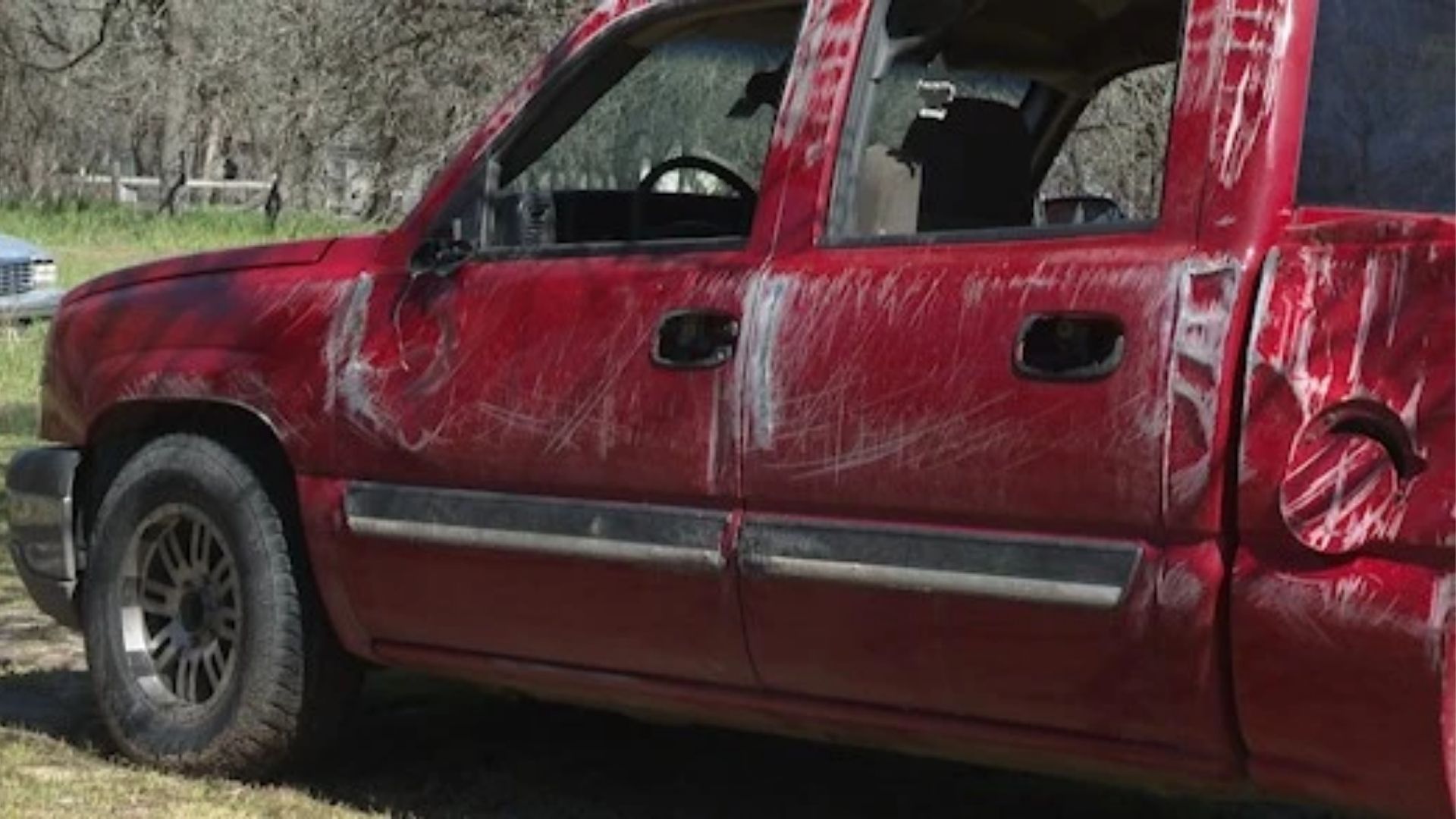 Below are images of what the truck looks like now. The windows are blown out. The side panels are dented and scraped. The rearview mirrors are gone.