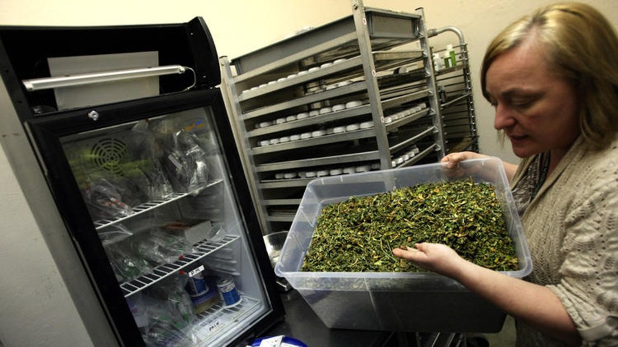Christie Lunsford of Dixie Elixirs & Edibles in Denver holds a container of marijuana trim that is used to infuse their products. (Credit: Los Angeles Times)