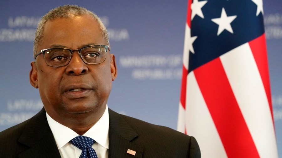 U.S. Secretary of Defense Lloyd Austin talks during the press conference with Minister of Defence of Latvia Artis Pabriks during the press conference in Riga, Latvia, Wednesday, Aug. 10, 2022. (AP Photo/Roman Koksarov)