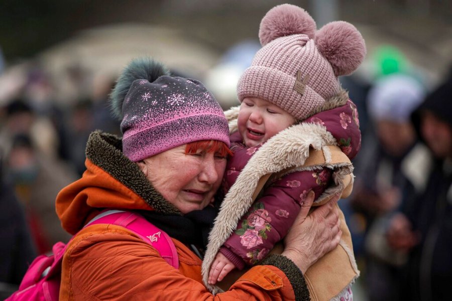 A woman holding a child cries after fleeing from the Ukraine and arriving at the border crossing in Medyka, Poland, Monday, March 7, 2022. Russia announced yet another cease-fire and a handful of humanitarian corridors to allow civilians to flee Ukraine. Previous such measures have fallen apart and Moscow’s armed forces continued to pummel some Ukrainian cities with rockets Monday. (AP Photo/Visar Kryeziu)