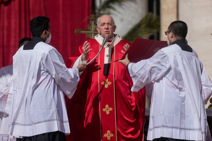 Pope Francis celebrates Palm Sunday Mass in St. Peter's Square at the Vatican, Sunday, April 10, 2022. The Roman Catholic Church enters Holy Week, retracing the story of the crucifixion of Jesus and his resurrection three days later on Easter Sunday. (AP Photo/Gregorio Borgia)