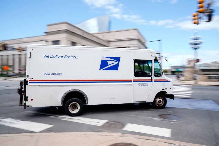 An United States Postal Service truck drives in Philadelphia, Friday, April 30, 2021. (AP Photo/Matt Rourke)