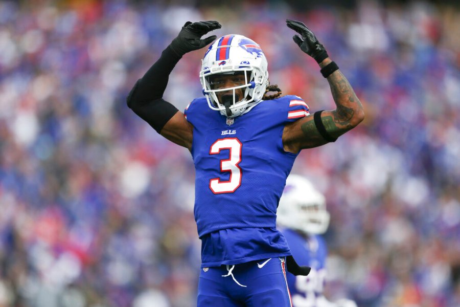 Buffalo Bills safety Damar Hamlin (3) reacts after a play during the first half of an NFL football game against the Pittsburgh Steelers on Sunday, Oct. 9, 2022, in Orchard Park, N.Y. (AP Photo/Joshua Bessex)