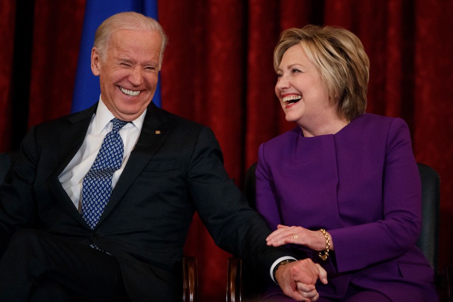 Vice President Joe Biden, left, laughs with former Secretary of State Hillary Clinton during a ceremony to unveil a portrait of Senate Minority Leader Harry Reid, D-Nev., on Capitol Hill, Thursday, Dec. 8, 2016, in Washington. (AP Photo/Evan Vucci)