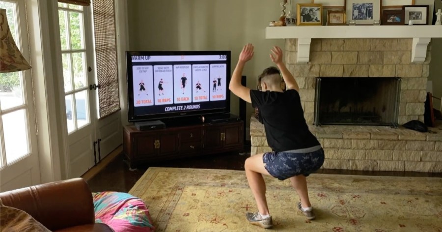 Videos include a warm-up followed by a mix of exercise and cardio. Items around the house sub in for weights at the gym.