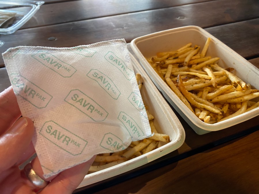 Each SAVRPak costs about 25 cents and they are made from food-grade materials, although you don’t want to eat one. Also, each pack is recyclable. SAVRPack says its freshness packet works with a variety of foods including many hot fried foods, pizza and even salads.