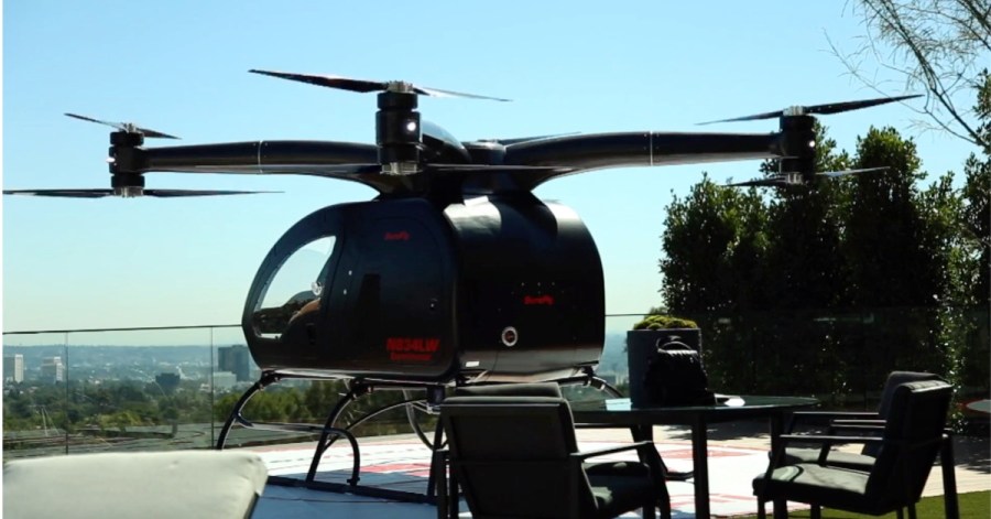 Think drone, but it can carry around you and someone else – anywhere you want to go in town. There are 8 rotors and a hybrid design that can fly for 2 hours at a time.