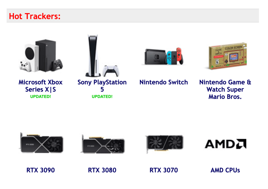 ZooLert has dedicated tracking pages that auto-update every minute. The site focuses on stock at “reputable” sites so you don’t get ripped off paying over MSRP. I like how everything is on one page and you can see the in-stock status, last selling price at that site, and the time the product was last available. Right now, data in that column is pretty much non-existent.