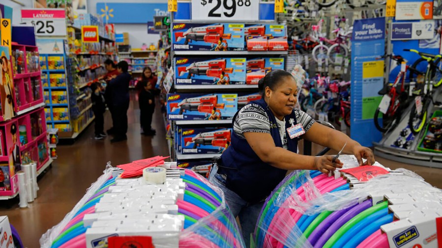 FILE - Balo Balogun labels items in preparation for a holiday sale at a Walmart Supercenter, Wednesday, Nov. 27, 2019, in Las Vegas. Walmart plans to hire 40,000 U.S. workers for the holidays, a majority of them seasonal workers. The move announced Wednesday, Sept. 21, 2022, comes as the nation’s largest retailer and largest private employer said it’s in a stronger staffing position heading into the holidays than last year. (AP Photo/John Locher, File)