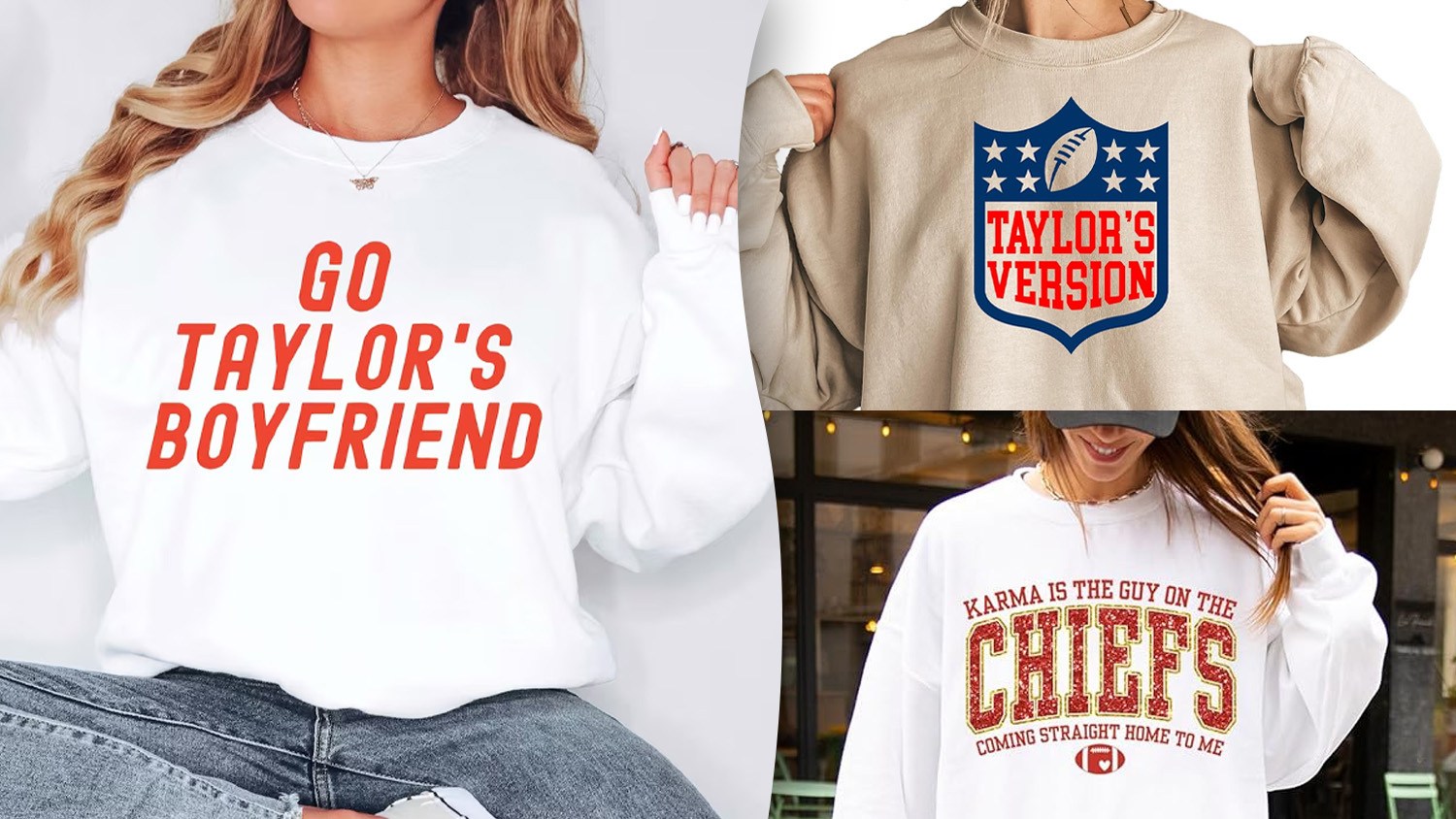 Shop this article: AlexTrend “Go Taylor’s Boyfriend” Shirt, Flawlessartshop “Karma Is The Guy On The Chiefs Coming Straight Home To Me” Sweatshirt, Printbox Originals “Let’s Go Taylor’s Boyfriend” Kansas Shirt