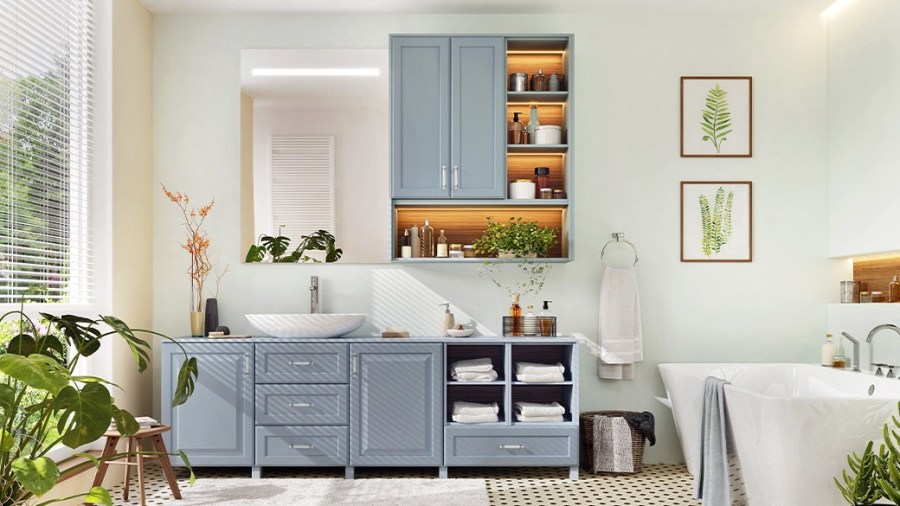 Many cabinets can be upgraded with additional features such as dimmable or multicolored lights, touchless controls and Bluetooth speakers. Some can even be controlled via your mobile phone. However, many of these features require the cabinet to be permanently wired to your home’s electrical system, which may make the installation more challenging.