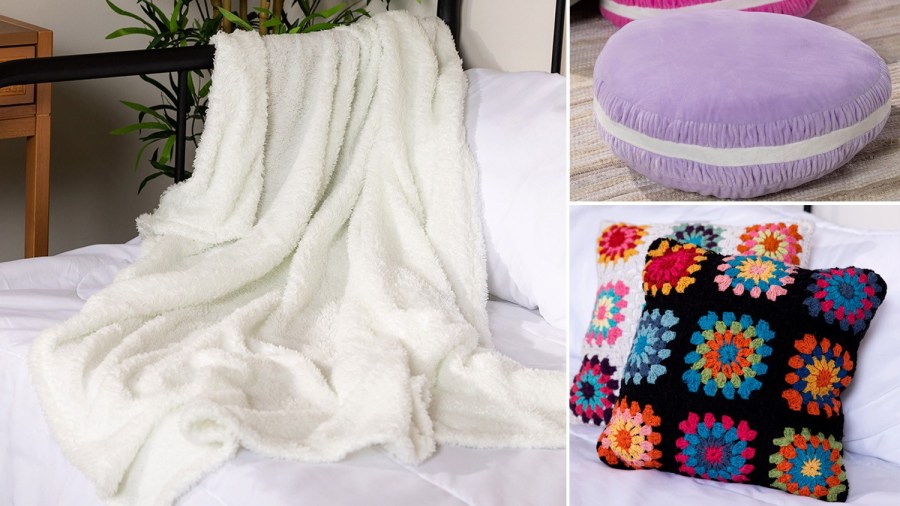 Shop this article: Luxe Collection Sherpa Blanket, Macaron Pillow, Granny Square Crochet Pillow