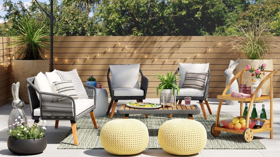 Shop this article: Winston Porter 48-inch Acacia Outdoor Loveseat, Ivy Bronx Rectangular Outdoor Coffee Table and Ebern Designs Sotherland Four-Person Outdoor Seating Group.