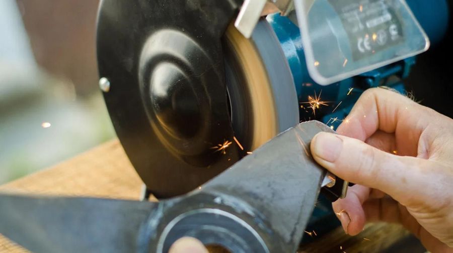 The 1/3-horsepower motor turns quietly at 1,750 rpm. This 41-pound bench grinder adjusts to different heights and uses grinding stones to put a sharp edge on your mower blade.