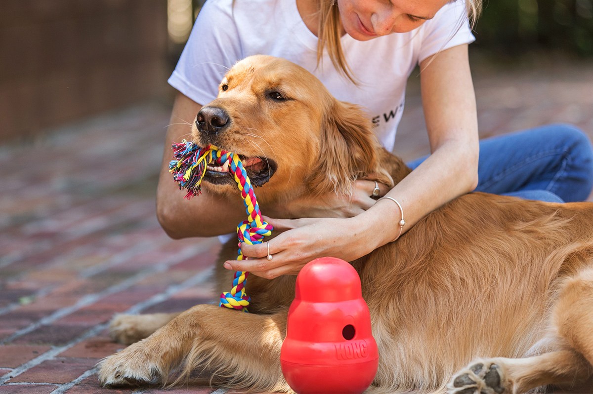 A dog that loves treats and toys will spend hours getting treats out of the rugged Wobbler. It’s a popular toy that comes in small and large sizes.