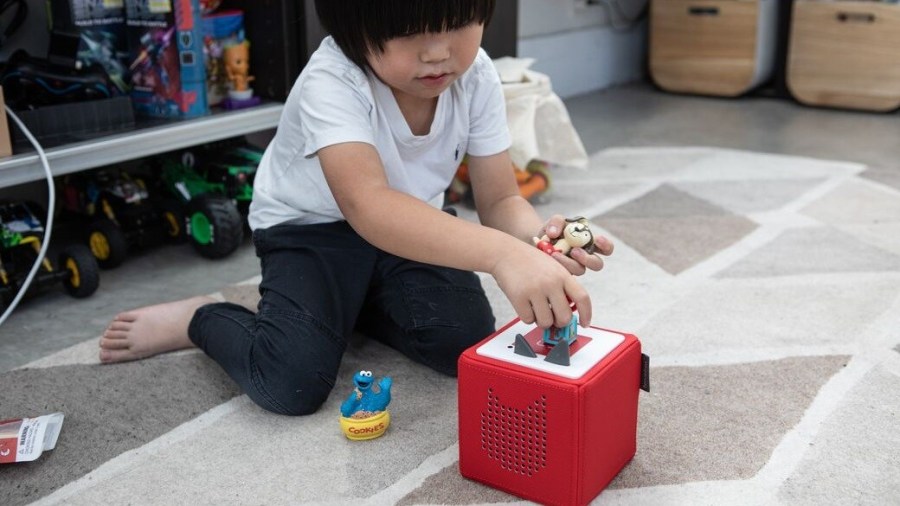 According to Tonies, the Toniebox is your lovable storytime friend. It’s a screen-free music and storybook player without flashing lights and unsightly buttons. The soft and squishy cube encourages cuddly playtime and learning.