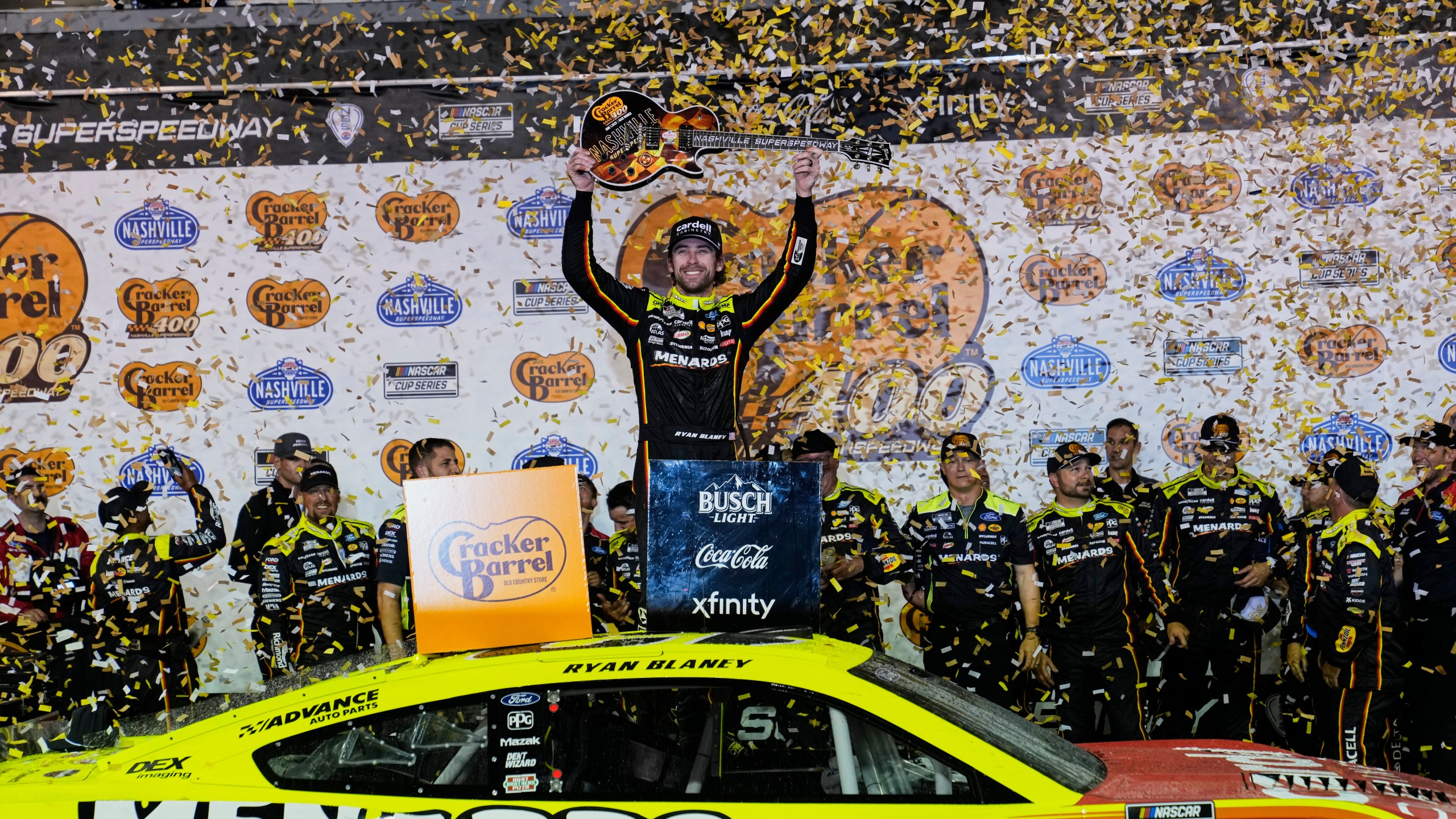 Blaney ran away down the stretch for his first Cup Series victory of the year Sunday night at Nashville Superspeedway, then he celebrated with a burnout in front of the roaring fans after what he called a rough year.
