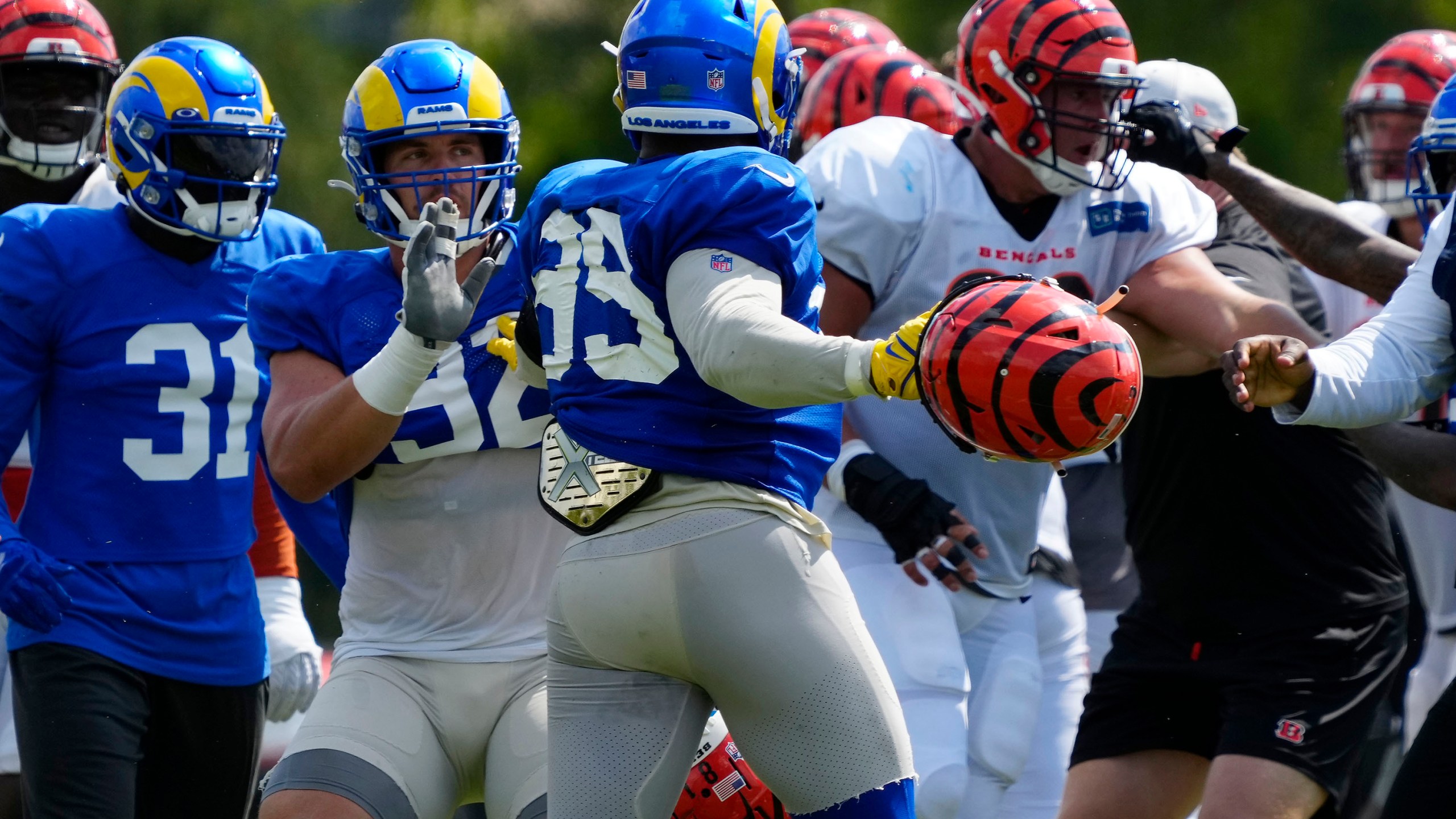 The three-time AP Defensive Player of the Year and seven-time All-Pro was thrown to the ground after swinging a helmet while players threw fists in a free-for-all that ended the session between the visiting Los Angeles Rams and the Bengals.
