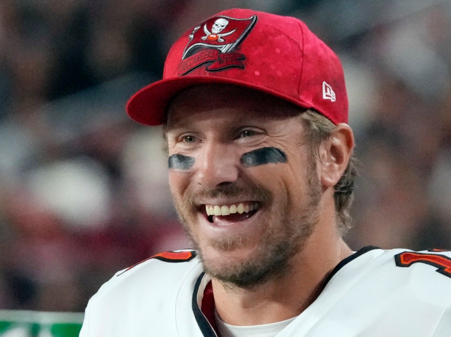FILE - Tampa Bay Buccaneers quarterback Blaine Gabbert (11) during the second half of an NFL football game against the Arizona Cardinals, Sunday, Dec. 25, 2022, in Glendale, Ariz. Gabbert helped rescue four people whose helicopter crashed into the Hillsborough Bay after it lost power. The Tampa Police Department said Friday, Dec. 30, 2022, that Gabbert had been riding on a jet ski with his two brothers on their own water vehicles in the bay south of Tampa Thursday evening when they spotted the helicopter broken up into pieces in the water. (AP Photo/Rick Scuteri, File)