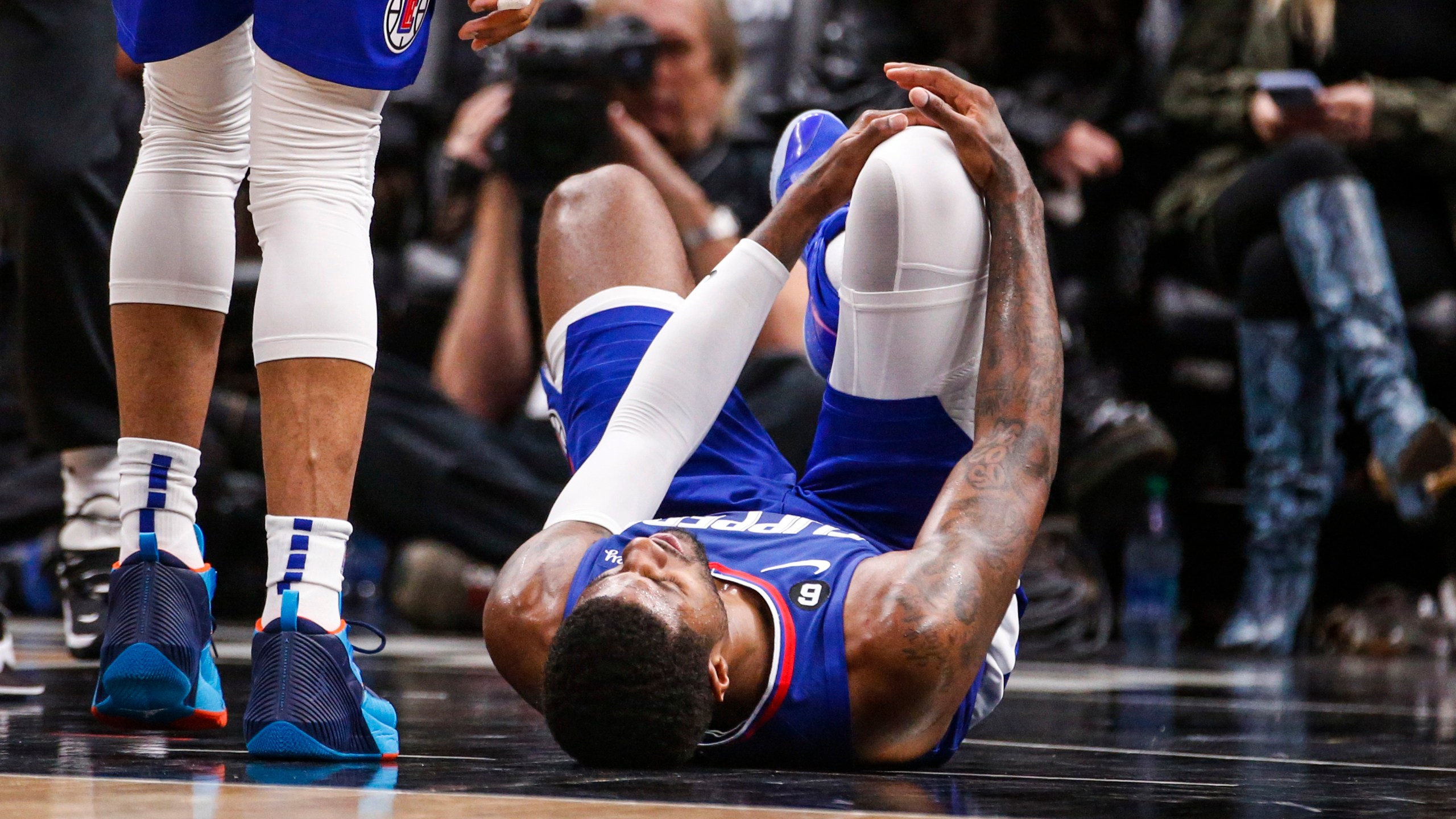 There was no immediate update on George after the game. Clippers coach Tyronn Lue said he was still being evaluated. George later left the arena on the back of a cart with his right leg extended.
