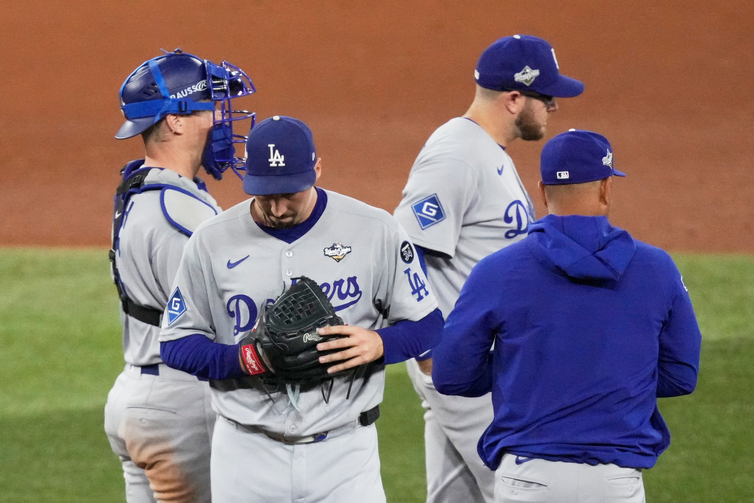 Los Angeles Dodgers pitcher Blake Snell leaves the game against the Toronto Blue Jays during the sixth inning in Game 1 of baseball’s World Series, Friday, Oct. 24, 2025, in Toronto. (AP Photo/Brynn Anderson)