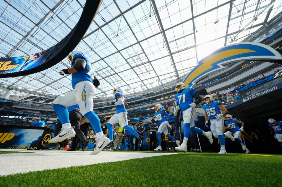 Los Angeles Chargers players run onto the field before a preseason NFL football game against the Seattle Seahawks in Inglewood, Calif., Saturday, Aug. 10, 2024. (AP Photo/Gregory Bull)